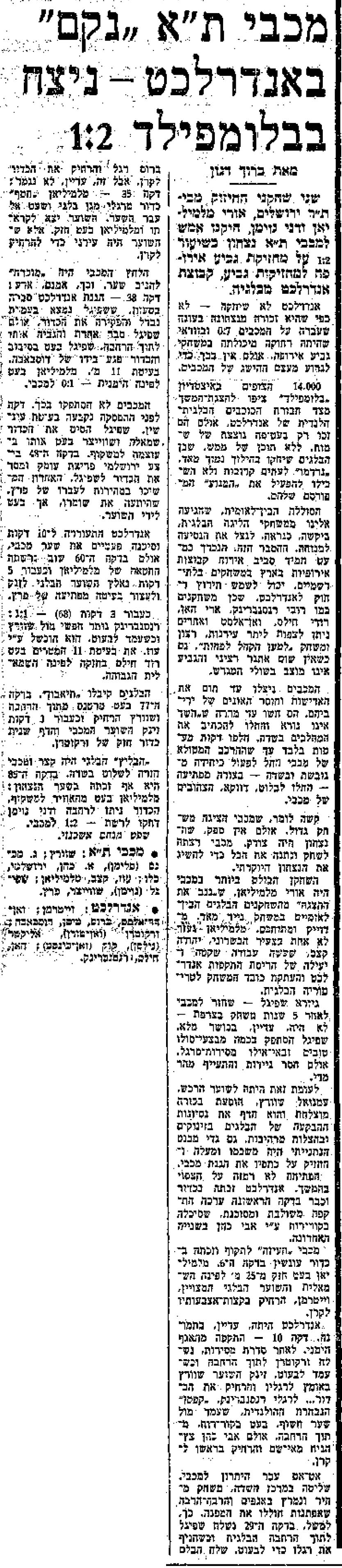 | 02:24, 3 ביולי 2022 | העולם הזה 13-09-1978 אנדרלכט (20-09-1978).jpg (קובץ) | 1.3 מ"ב | == תקציר == מכבי תל אביב ניצחה את אנדרלכט, משחק ידידות, ספטמבר 1979 | 1 | |