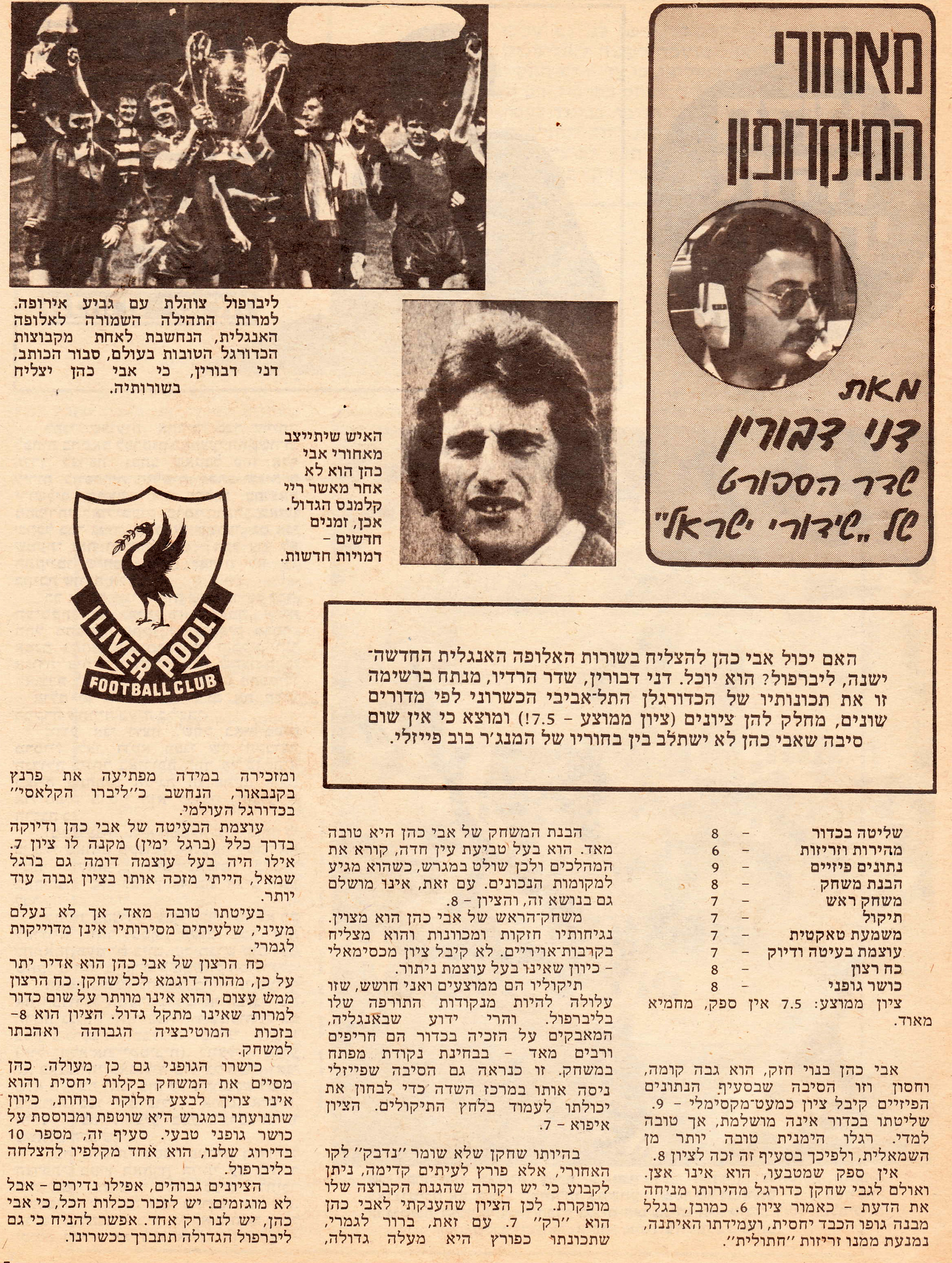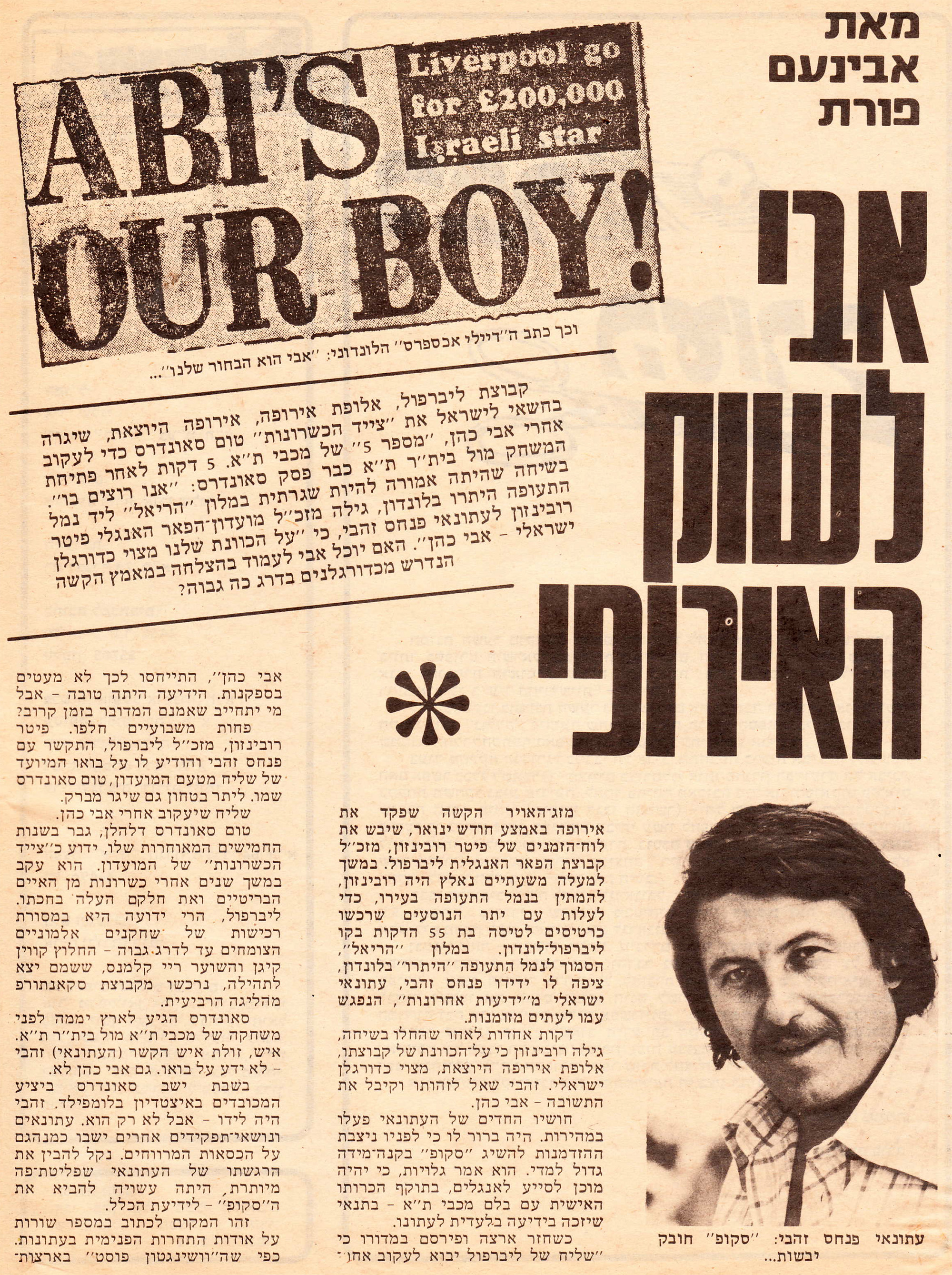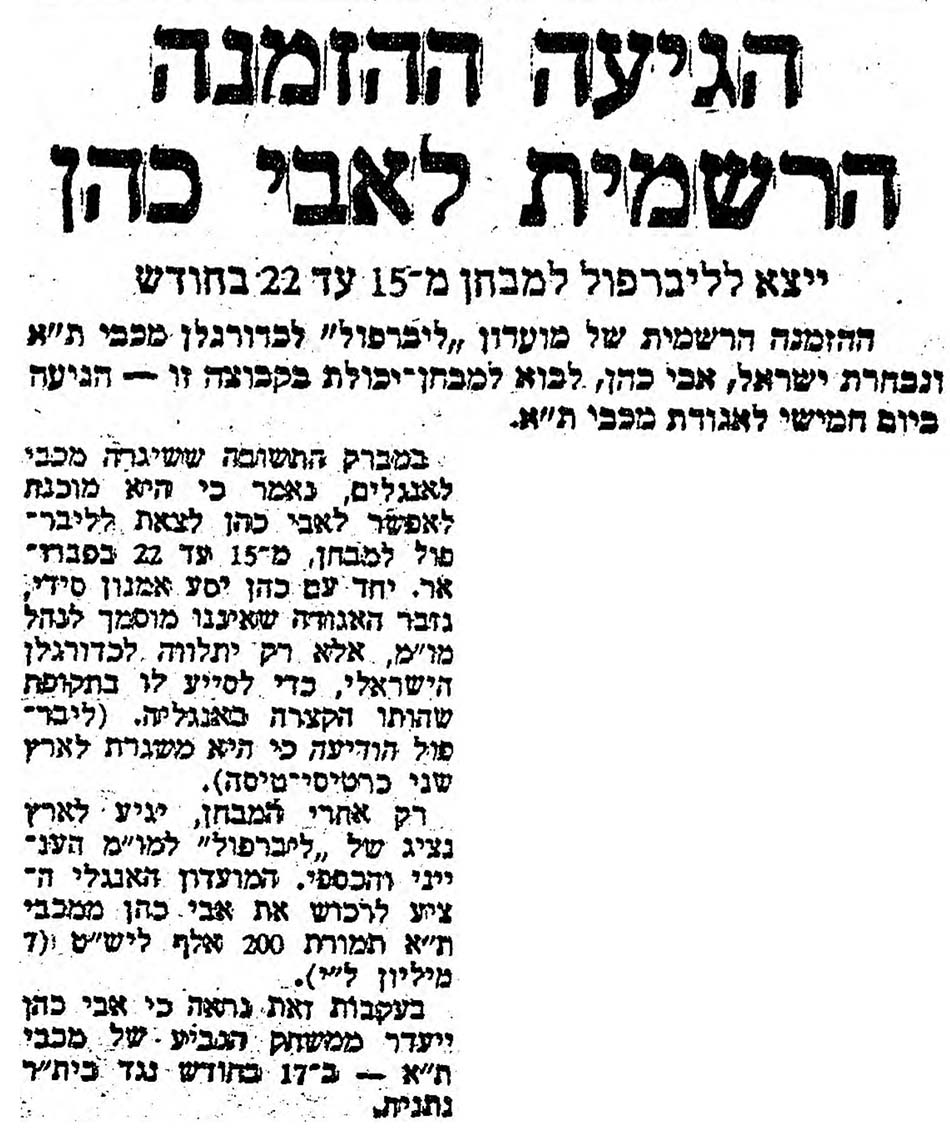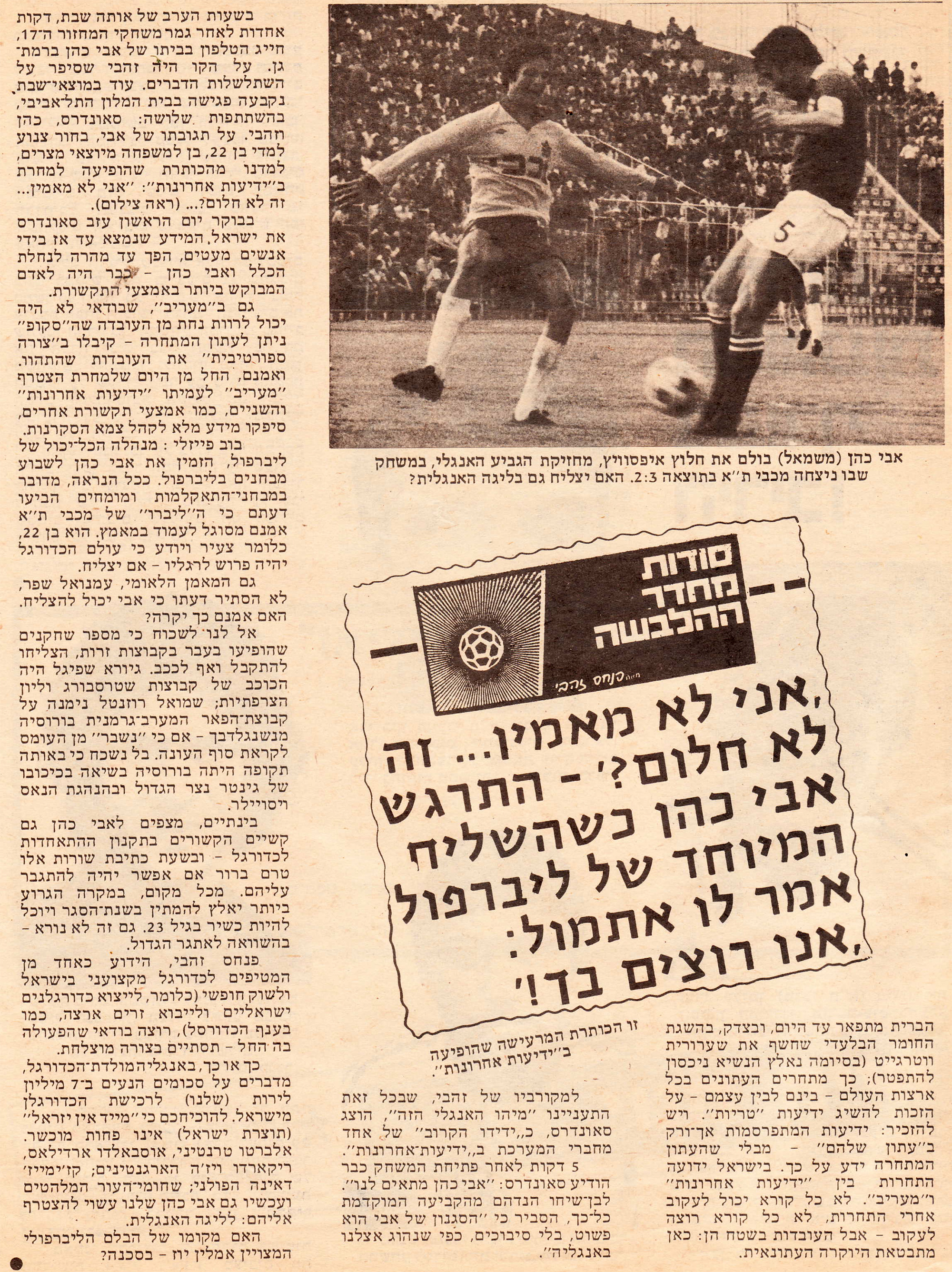 | 00:13, 19 ביוני 2022 | שמועות אודות עזיבת אבי כהן לליברפול 2.jpg (קובץ) | 2.74 מ"ב | == תקציר == {{תיוג שחקנים |שחקן1=אבי כהן }} שמועות לקראת עזיבתו של אבי כהן לליברפול, אחרי חצי גמר גביע המדינה מול ביתר ת"א בעונת 1978/79 | 1 | |