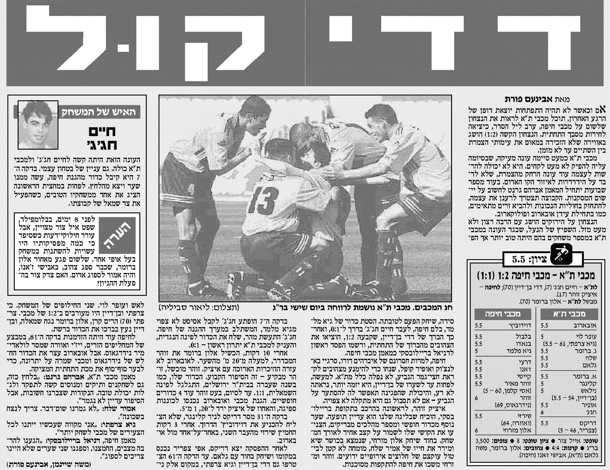 |שיוך משחק=משחק: 10-04-1998 מכבי תל אביב נגד מכבי חיפה - ליגה לאומית}} | |שיוך משחק=משחק:10-04-1998 מכבי תל אביב נגד מכבי חיפה - ליגה לאומית}} | ||